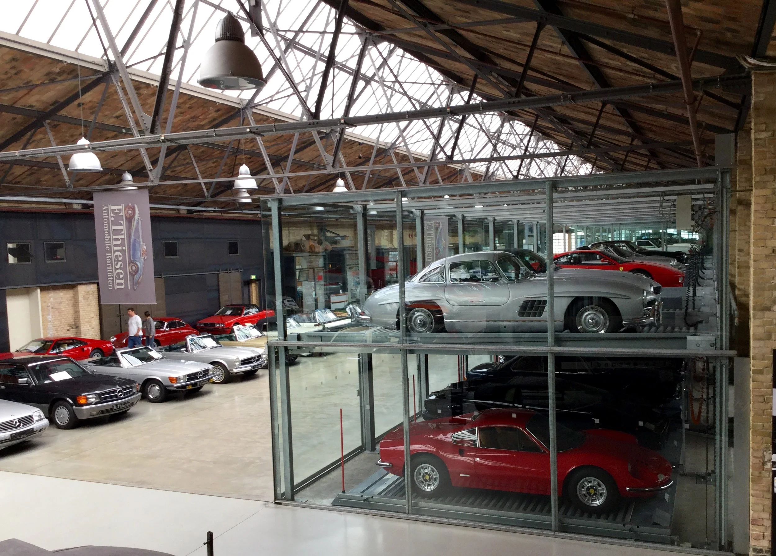 On the left are automobiles for sale and on the right are private collections....see that silver car on top of the red Ferrari? It's a 1955 Mercedes-Benz 300SL....the original gull wing door car. A similar version recently sold at auction for over $4,000,000 USD.